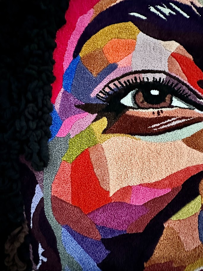 Je ziet de grafische, strakke vormen maar de gepunnikte draden komen op je af. De knopen, de chaos, de diepte. Het is er allemaal maar je moet dichterbij komen om het ook echt te zien en te voelen.